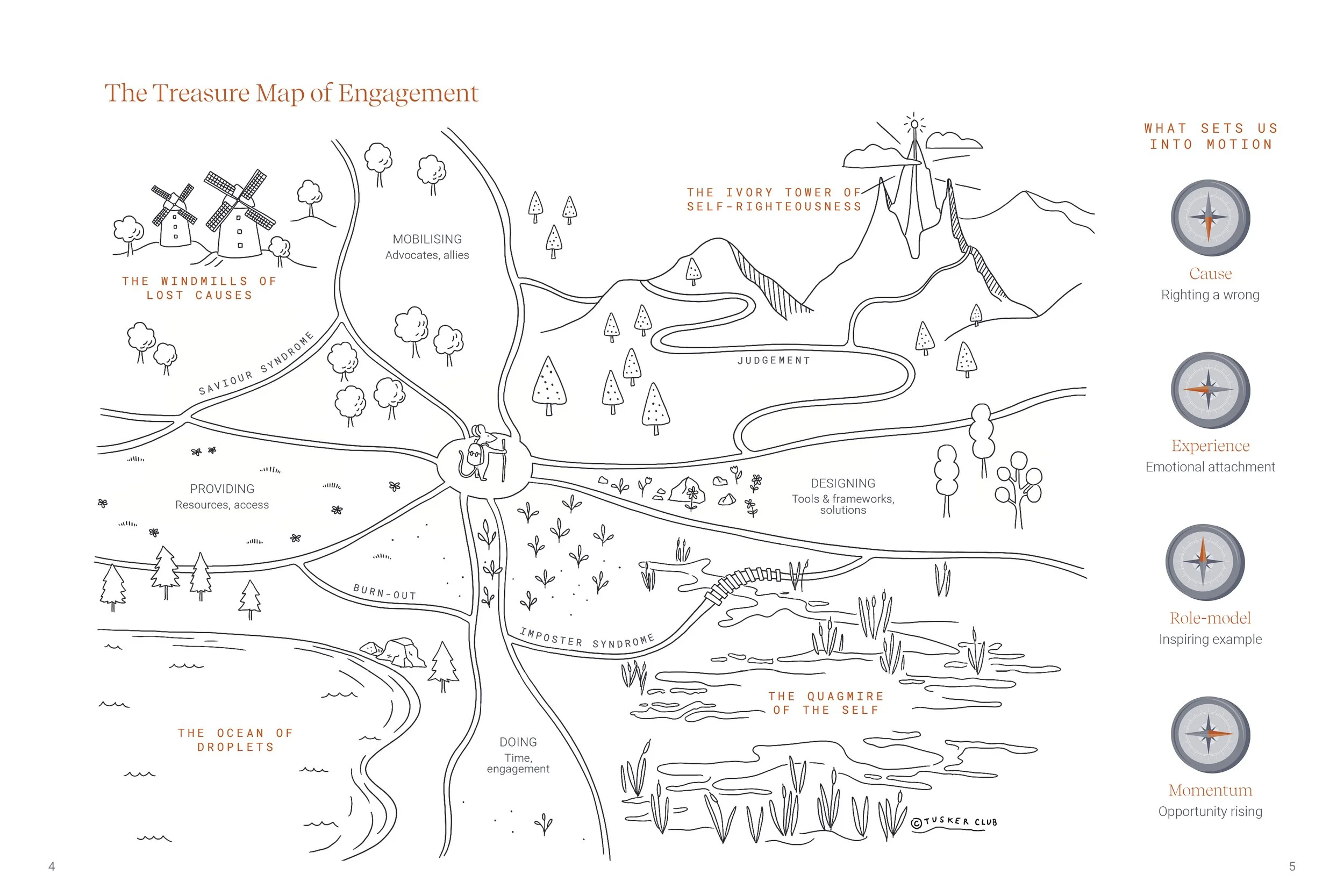 The map’s four corners symbolise the challenges we face: the Windmills of Lost Causes, where efforts feel futile; the Ivory Tower of Self-Righteousness, where engagement risks becoming limited; the Ocean of Droplets, where actions seem too small to matter; and the Quagmire of the Self, where personal fears and doubts hinder progress. Between these obstacles, we offer a guide to understand what sets us in motion, as well as routes to navigate the journey.